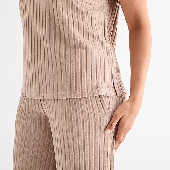 Sleep or lounge comfortably in this 2-piece women's pajama set from Liz Claiborne. Made from soft, ribbed stretch-knit, it includes a short-sleeve top with a bateau neckline and a side slit hem. Plus it features a pair of pull-on pants fitted with an elastic-waistband side pockets and straight legs.